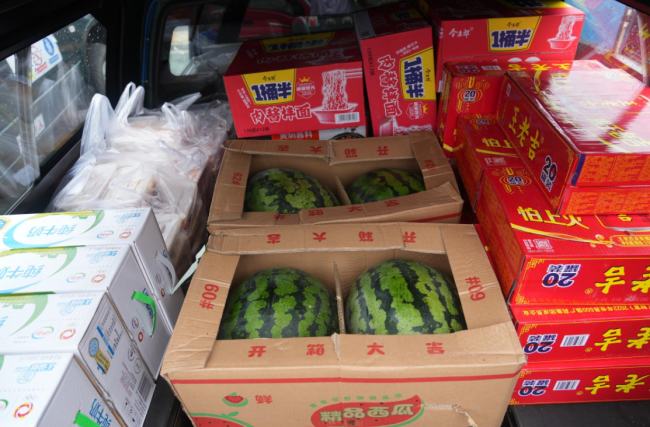 10点30分,满载慰问品的无轨防爆胶轮车驶入井下,车里有打包好的排骨土豆、西红柿炒鸡蛋盖饭,还有桶装米线、粉丝、拌面、牛奶、火腿肠、西瓜、王老吉等食品。