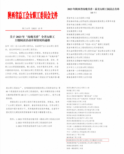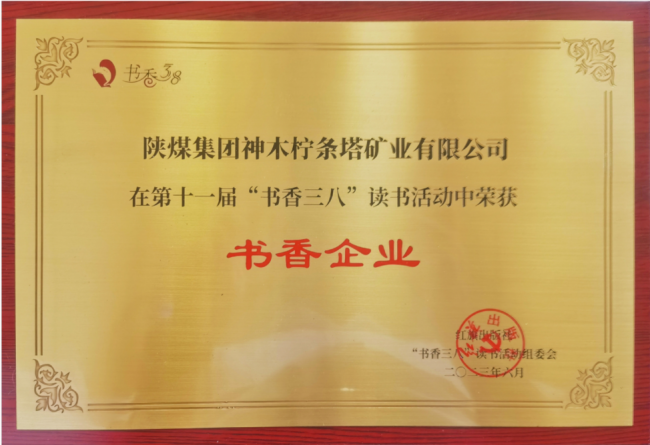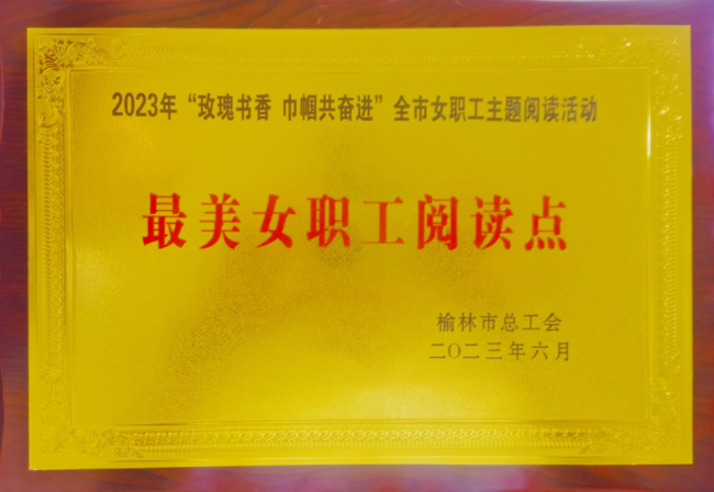 今年6月,公司在第十届“书香三八”读书活动中荣获书香企业荣誉称号。巾帼示范展示区在榆林市总工会“玫瑰书香·巾帼共奋进”全市女职工主题阅读活动中获评“最美女职工阅读点”。